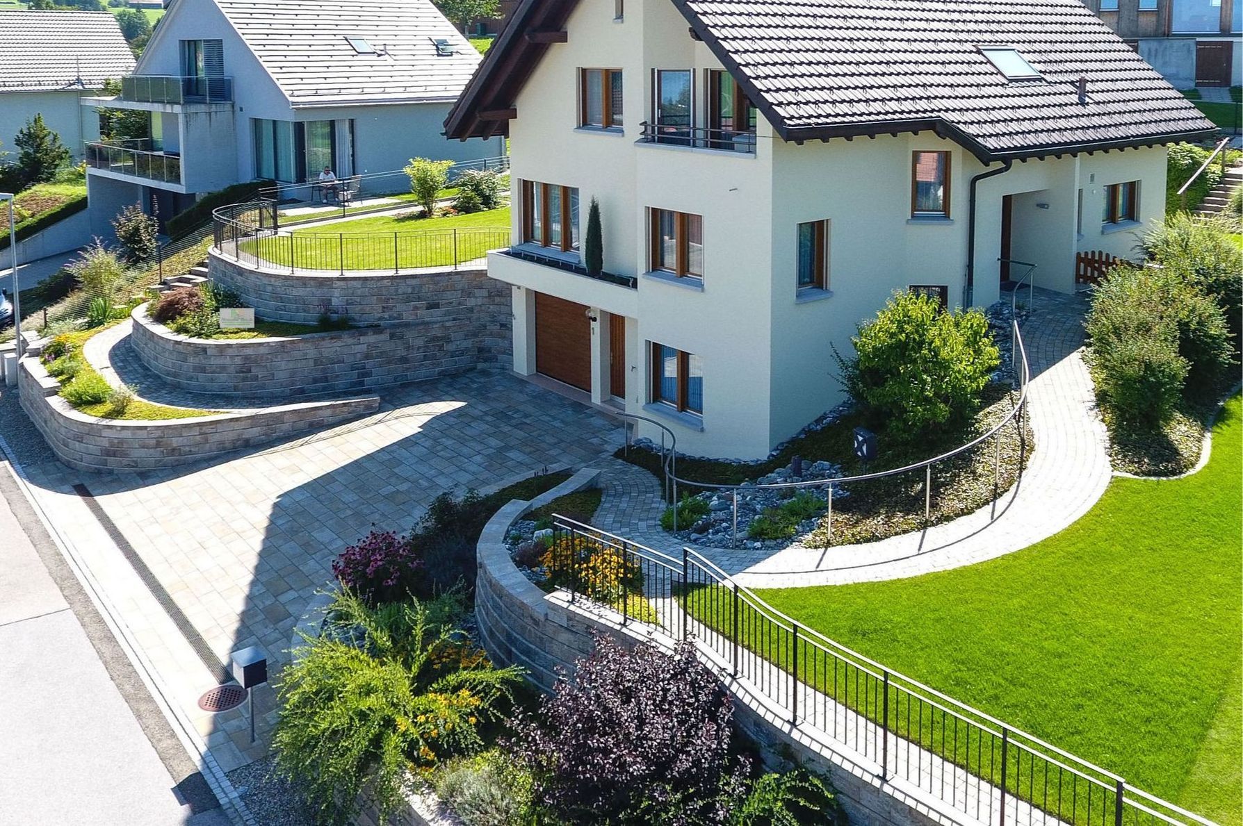mit großer Einfahrt, neuen Gehwegen und Hangstützmauern als Terrassenfeldern im Rundbogen.