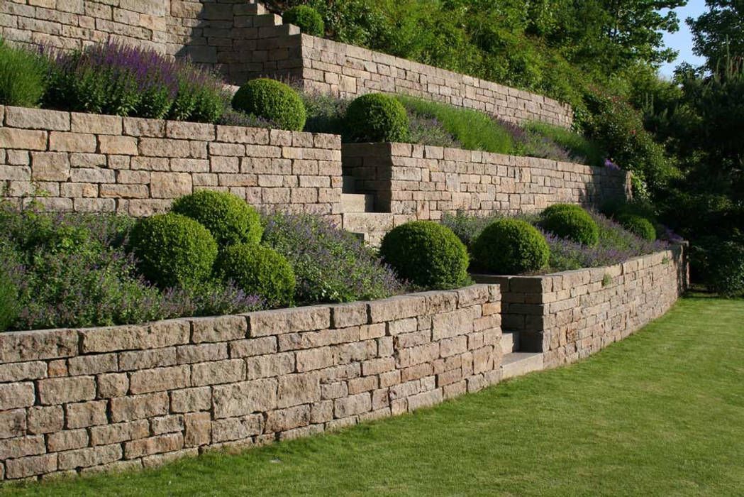 - Erstellen einer Hangsicherung als bepflanzte Terrassenfeldmauern aus Luxemburger Natursandstein