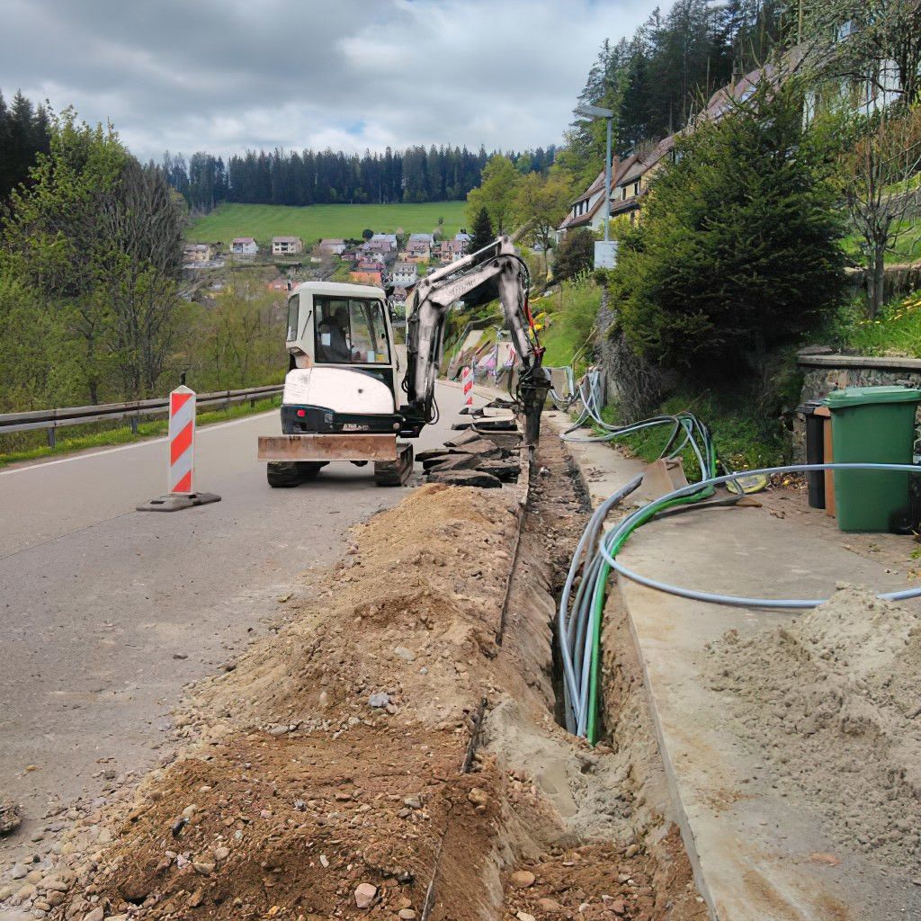 - Verlegung und Anschluss aller Leitungen von der Straße zum Haus (Frischwasser, Abwasser, Regenwasser, Oberflächenwasser, Erdgas, Strom, Klingelanlage, Alarmanlage, Internet, Telefon und Glasfaser)