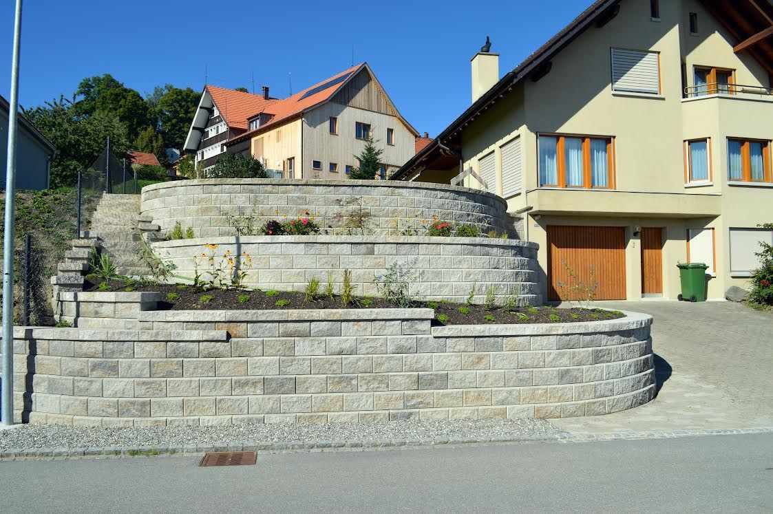 - Bau großer Hangstützmauern mit mehreren bepflanzten Terrassenfeldern in Rundbogenform